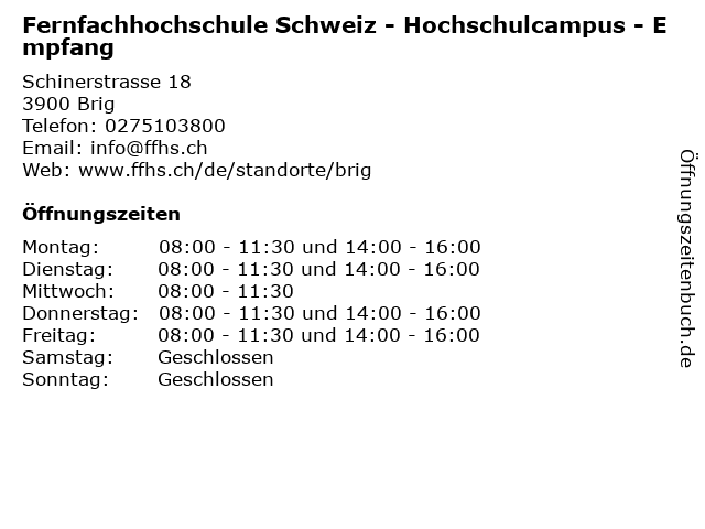 Branchen & Suchbegriffe zu Fernfachhochschule Schweiz - Hochschulcampus - Empfang:ausbildung, brig, empfang, fernfachhochschule, fernstudium, hfh, hochschulcampus, hochschule, lehranstalt, lernen, schweiz, sekretariat, studienberatung, studienzentrum, technik, universiät, unterricht |