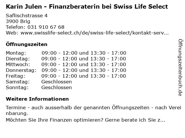 1 Barbara Jelas - Finanzberaterin bei Swiss Life Select (Entfernung: 0,00 km) Saflischstrasse 4, 3900 Brig 2 Marc Zurwerra - Führungskraft bei Swiss Life Select (Entfernung: 0,01 km) Saflischstrasse 4, 3900 Brig 3 Martin Julier - Führungskraft bei Swiss Life Select (Entfernung: 0,01 km) Saflischstrasse 4, 3900 Brig 4 Marvin Gasser - Finanzberater bei Swiss Life Select (Entfernung: 0,01 km) Saflischstrasse 4, 3900 Brig 5 Celine Rüttimann - Finanzberaterin bei Swiss Life Select (Entfernung: 0,01 km) Saflischstrasse 4, 3900 Brig 6 Christoph Escher - Finanzberater bei Swiss Life Select (Entfernung: 0,01 km) Saflischstrasse 4, 3900 Brig |