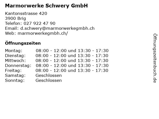 | Öffnungszeiten Marmorwerke Schwery GmbH in Brig anzeigen | |