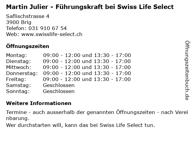 2 Marc Zurwerra - Führungskraft bei Swiss Life Select (Entfernung: 0,00 km) Saflischstrasse 4, 3900 Brig 3 Marvin Gasser - Finanzberater bei Swiss Life Select (Entfernung: 0,01 km) Saflischstrasse 4, 3900 Brig 4 Celine Rüttimann - Finanzberaterin bei Swiss Life Select (Entfernung: 0,01 km) Saflischstrasse 4, 3900 Brig 5 Christoph Escher - Finanzberater bei Swiss Life Select (Entfernung: 0,01 km) Saflischstrasse 4, 3900 Brig 6 David Jordan - Finanzberater bei Swiss Life Select (Entfernung: 0,01 km) Saflischstrasse 4, 3900 Brig |