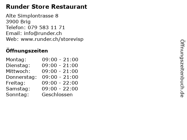 | Öffnungszeiten Runder Store Restaurant in Brig anzeigen | |