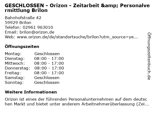 Branchen & Suchbegriffe zu GESCHLOSSEN - Orizon - Zeitarbeit & Personalvermittlung Brilon:arbeitsvermittler, berufsberater, bewerbungsservice, brilon, geschlossen, orizon, personalvermittlung, zeitarbeit, zeitarbeitsvermittlung |