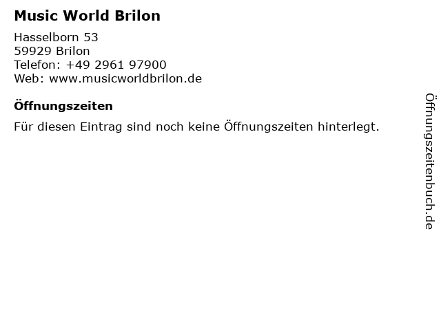 | Öffnungszeiten Music World Brilon in Brilon anzeigen | |