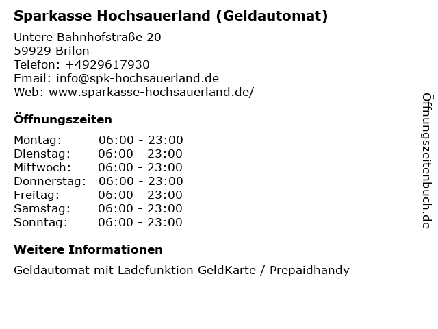 4 Sparkasse Mitten im Sauerland (Geldautomat) (Entfernung: 9,01 km) Dominitstraße 5, 59929 Brilon-Hoppecke 6 |