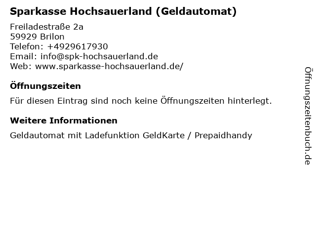 3 Sparkasse Mitten im Sauerland (Geldautomat) (Entfernung: 4,95 km) Dominitstraße 5, 59929 Brilon-Hoppecke 5 Sparkasse Mitten im Sauerland (Geldautomat) (Entfernung: 7,47 km) Untere Bahnhofstraße 20, 59929 Brilon 6 |