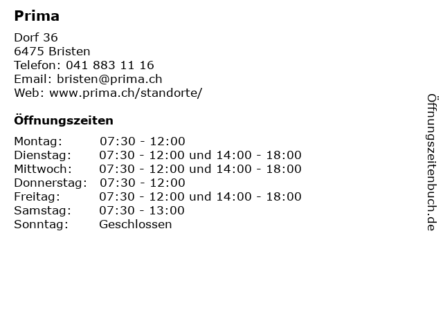 | Öffnungszeiten Prima in Bristen anzeigen | |