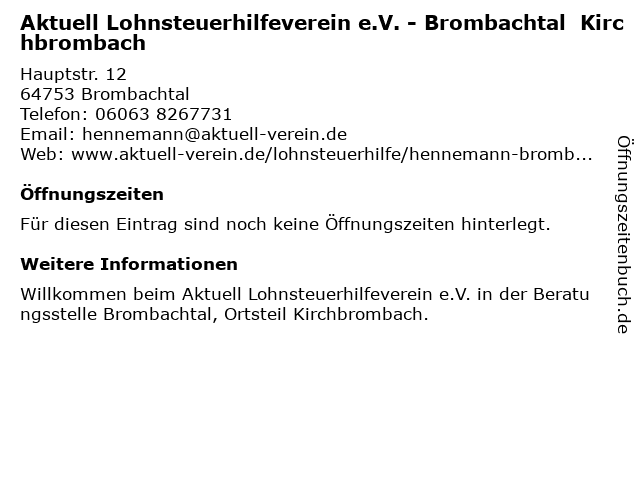 | Aktuell Lohnsteuerhilfeverein e.V. - Brombachtal Kirchbrombach anrufen | |