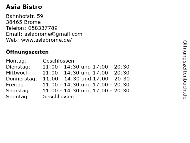| Öffnungszeiten Asia Bistro in Brome anzeigen | |