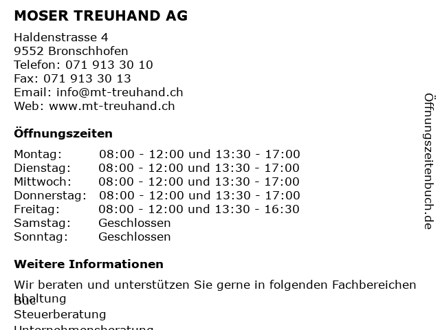 | Öffnungszeiten MOSER TREUHAND AG in Bronschhofen anzeigen | |
