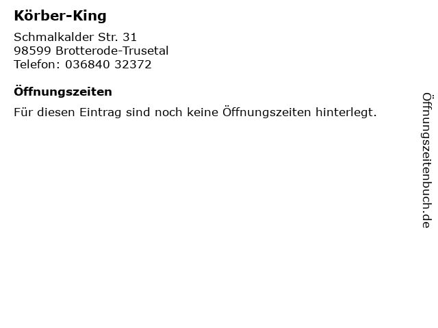 | Öffnungszeiten Körber-King in Brotterode-Trusetal anzeigen | |