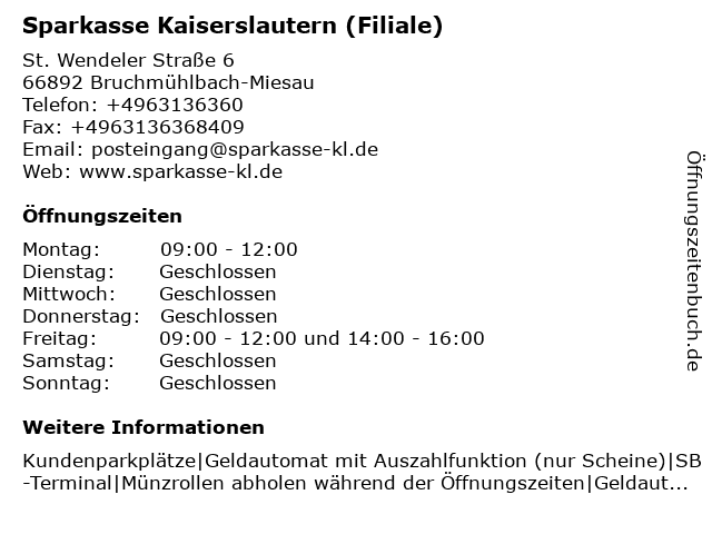 2 5 Sparkasse Kaiserslautern (SB-Filiale) (Entfernung: 10,52 km) Ramsteiner Straße 14a, 66877 Ramstein-Miesenbach 6 |