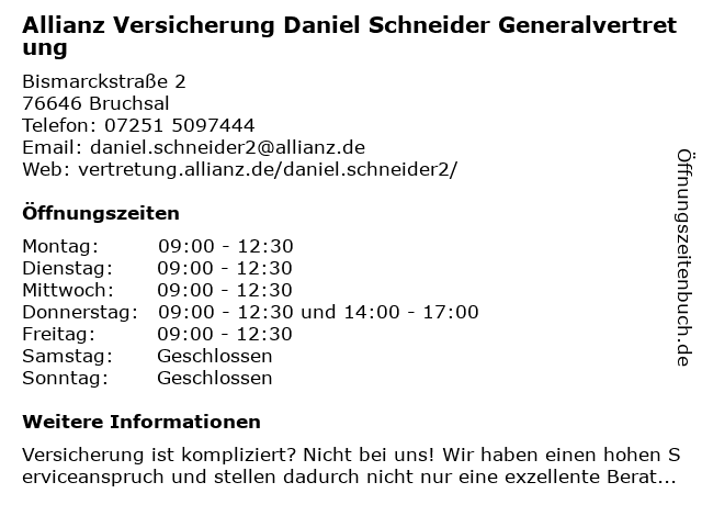 1 Allianz Versicherung Daniel Schneider Hauptvertretung (Entfernung: 0,00 km) Bismarckstraße 2, 76646 Bruchsal 3 Allianz Versicherung Jörg Himmler Generalvertretung (Entfernung: 0,63 km) Franz-bläsi-straße 11, 76646 Bruchsal 6 |
