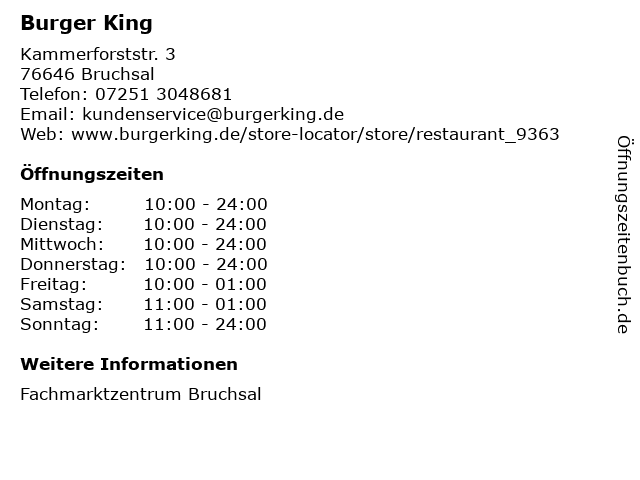 | Öffnungszeiten Burger King in Bruchsal anzeigen | |