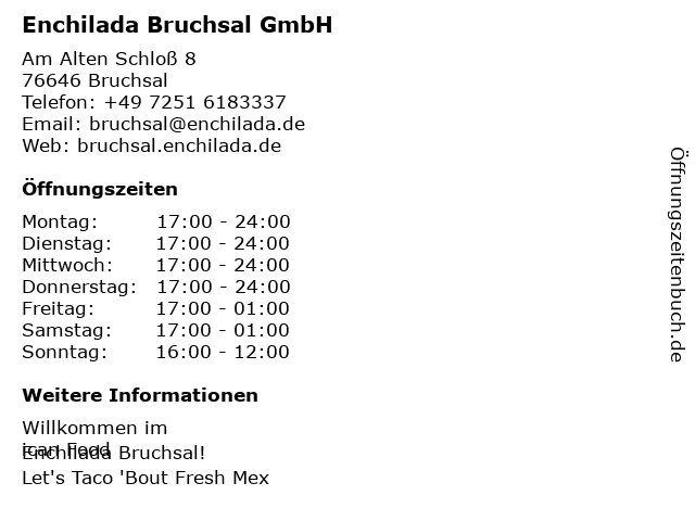 | Öffnungszeiten Enchilada Bruchsal GmbH in Bruchsal anzeigen | |