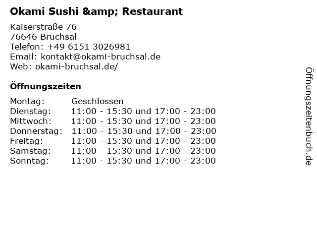 | Öffnungszeiten Okami Sushi & Restaurant in Bruchsal anzeigen | |