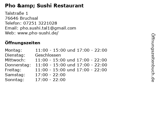 | Öffnungszeiten Pho & Sushi Restaurant in Bruchsal anzeigen | |