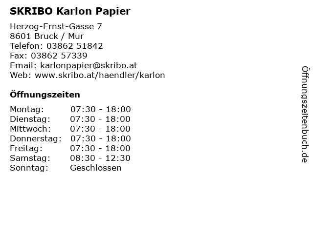 | Öffnungszeiten SKRIBO Karlon Papier in Bruck / Mur anzeigen | |