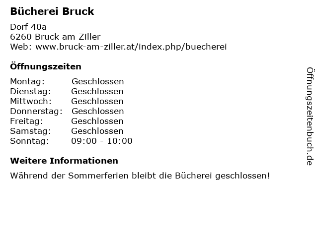 | Öffnungszeiten Bücherei Bruck in Bruck am Ziller anzeigen | |