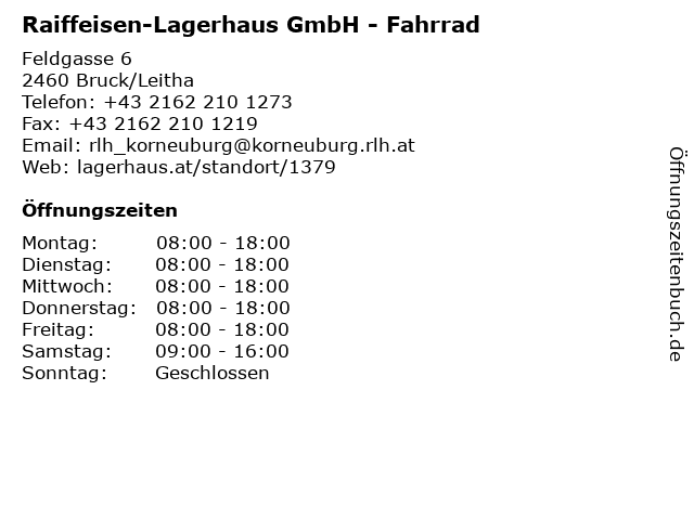 2 Raiffeisen-Lagerhaus GmbH - Motor- & Gartentechnik (Entfernung: 0,00 km) Feldgasse 6, 2460 Bruck/Leitha 3 Raiffeisen-Lagerhaus GmbH - Zentrale und Brennstoffe (Entfernung: 0,07 km) Lagerhausstraße 3, 2460 Bruck/L. 6 |