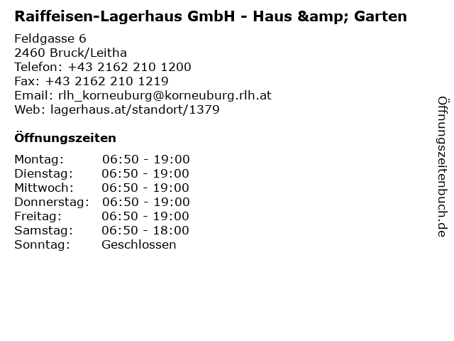 2 Raiffeisen-Lagerhaus GmbH - Motor- & Gartentechnik (Entfernung: 0,00 km) Feldgasse 6, 2460 Bruck/Leitha 3 Raiffeisen-Lagerhaus GmbH - Zentrale und Brennstoffe (Entfernung: 0,07 km) Lagerhausstraße 3, 2460 Bruck/L. 6 |