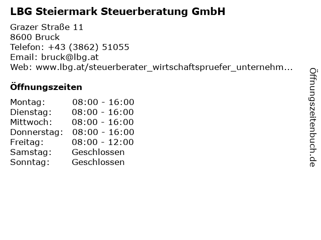 | 1 LBG Steiermark Steuerberatung GmbH (Entfernung: 0,42 km) Koloman-Wallisch-Platz 10, 8600 Bruck an der Mur 3 Verein für Männer- und Geschlechterthemen Steiermark - Männerberatung Bruck/Mur (Entfernung: 0,13 km) Erzherzog-Johann-Gasse 10, 8600 Bruck/Mur 4 Caritas Steiermark - Carla - Second Hand Shop (Entfernung: 0,36 km) Roseggerstraße 6-8, 8600 Bruck an der Mur 5 Volksbank Steiermark AG - (Bankomat Filiale) (Entfernung: 0,47 km) Burggasse 4, 8600 Bruck an der Mur 6 |