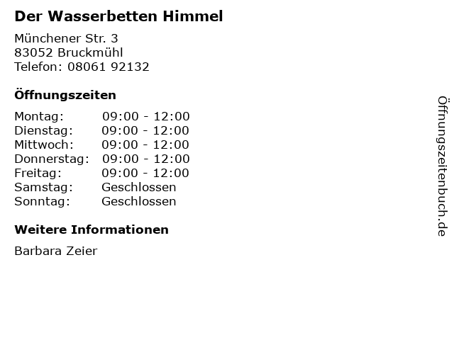 | Öffnungszeiten Der Wasserbetten Himmel in Bruckmühl anzeigen | |