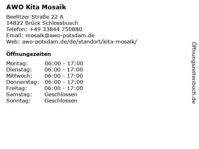 | Öffnungszeiten AWO Kita Mosaik in Brück Schlossbusch anzeigen | |