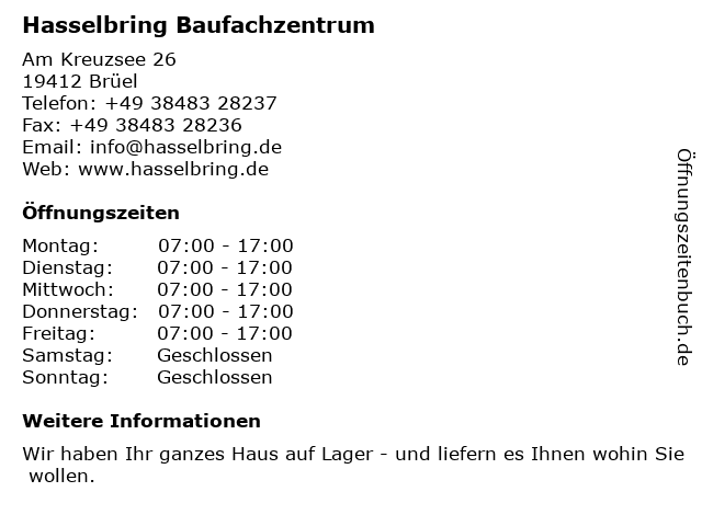 | Öffnungszeiten Hasselbring Baufachzentrum in Brüel anzeigen | |