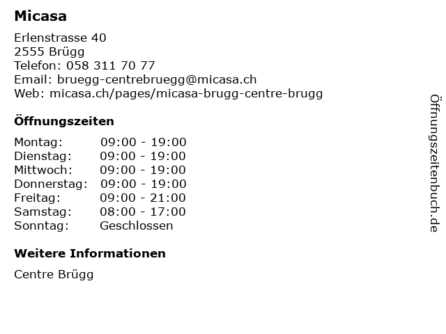 | Öffnungszeiten Micasa in Brügg anzeigen | |