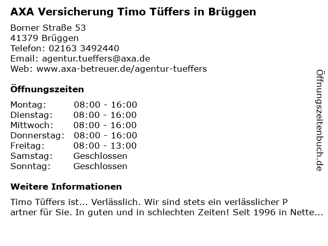 1 DBV Deutsche Beamtenversicherung Timo Tüffers in Brüggen (Entfernung: 0,00 km) Borner Straße 53, 41379 Brüggen 3 AXA Versicherung - Generalvertretung Versicherungsbüro Hegger GmbH (Entfernung: 14,97 km) Deversdonk 16, 47929 Grefrath 4 5 AXA Geschäftsstelle Klaus Paulußen (Entfernung: 15,87 km) Helmut-Grashoff-Str. 20, 41179 Mönchengladbach 6 |