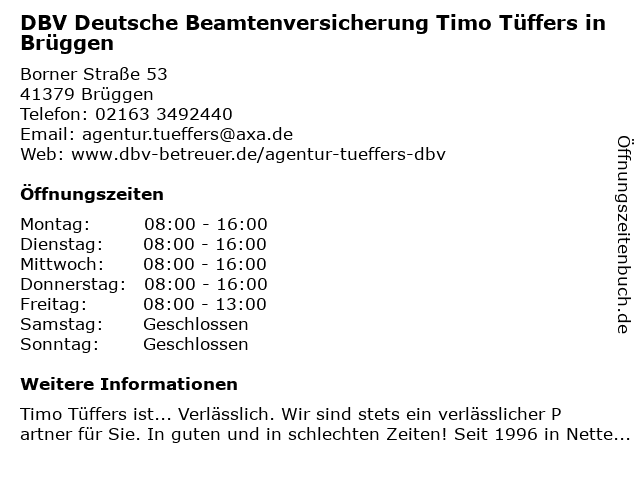 Branchen & Suchbegriffe zu DBV Deutsche Beamtenversicherung Timo Tüffers in Brüggen:autoversicherung, beamtenversicherung, berufshaftpflichtversicherung, dbv, deutsche, gebäude- und hausratsversicherung, lebensversicherung, timo, tüffers, unternehmen für versicherungsfachfragen, zahnmedizinische versicherung |