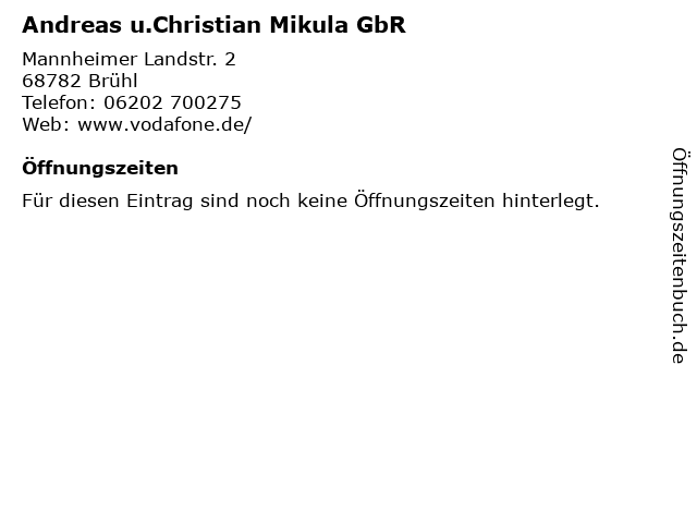 | Telefonnummer Andreas u.Christian Mikula GbR in Brühl (06202 700275) anrufen | |