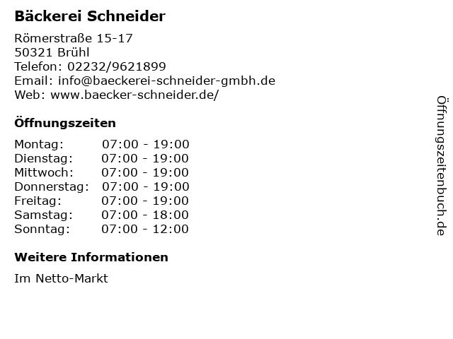 | Öffnungszeiten Bäckerei Schneider in Brühl anzeigen | |