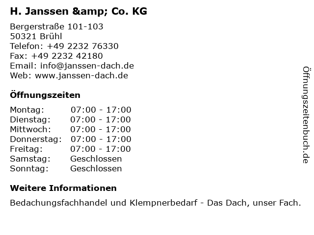 | Öffnungszeiten H. Janssen & Co. KG in Brühl anzeigen | |