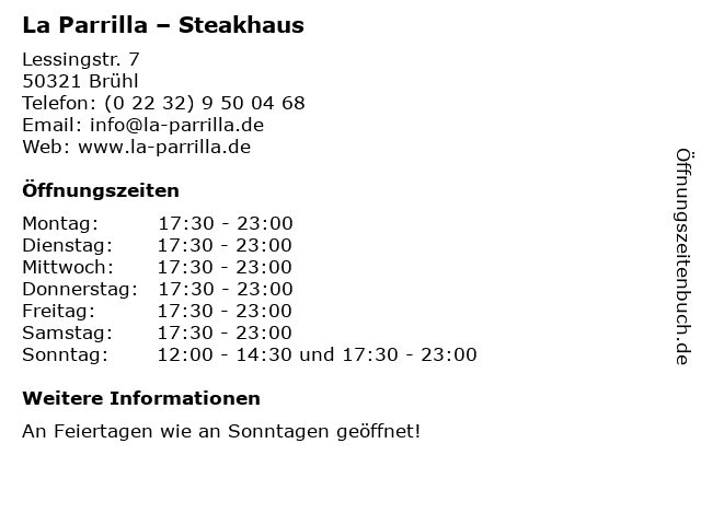 | Öffnungszeiten La Parrilla – Steakhaus in Brühl anzeigen | |