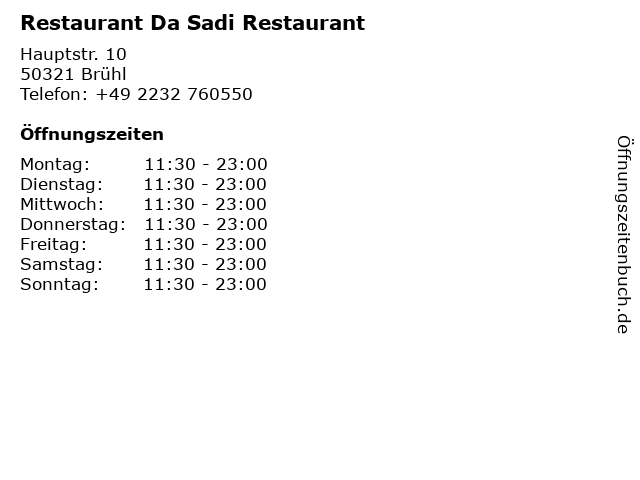 | Öffnungszeiten Restaurant Da Sadi Restaurant in Brühl anzeigen | |