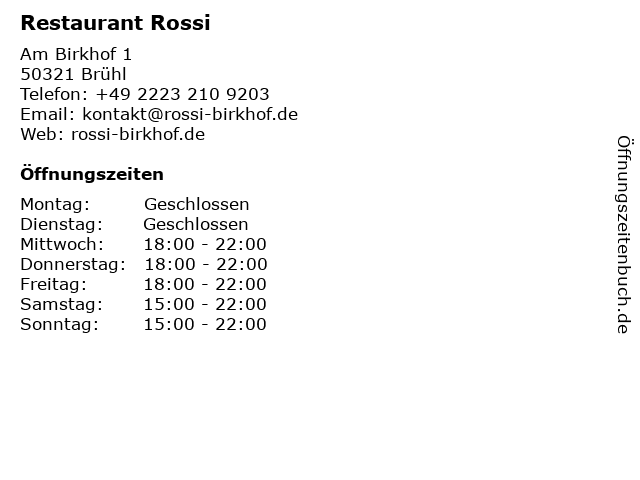 | Öffnungszeiten Restaurant Rossi in Brühl anzeigen | |