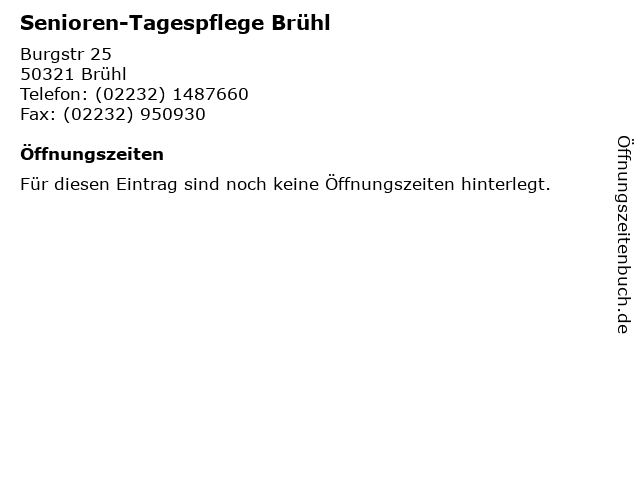 | Öffnungszeiten Senioren-Tagespflege Brühl in Brühl anzeigen | |