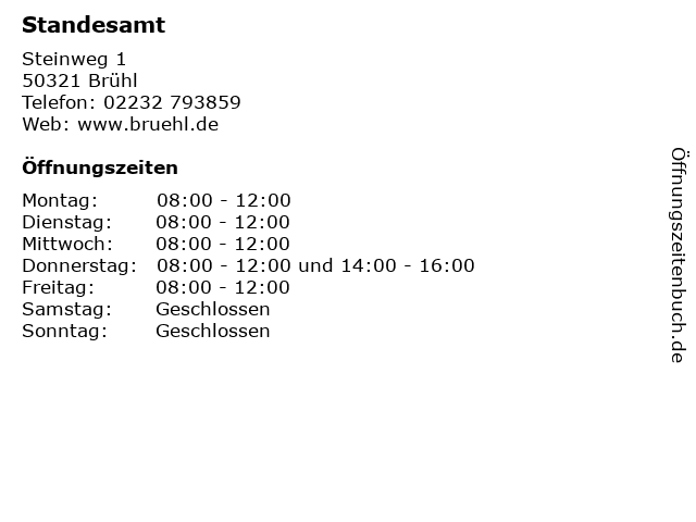 | Öffnungszeiten Standesamt in Brühl anzeigen | |