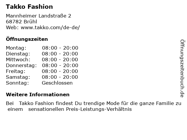 | Öffnungszeiten Takko Fashion in Brühl anzeigen | |