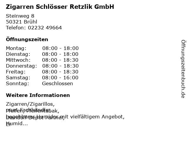 | Öffnungszeiten Zigarren Schlösser Retzlik GmbH in Brühl anzeigen | |