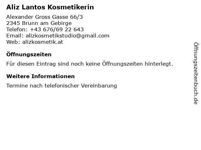 4 AUENG FHA - Thailändische Körperbehandlungen (Entfernung: 0,45 km) Leopold Gattringer-Straße 63, 2345 Brunn am Gebirge 5 LeBeSchön Kosmetikstudio in Brunn am Gebirge (Entfernung: 0,59 km) Wienerstraße 4, 2345 Brunn am Gebirge 6 |