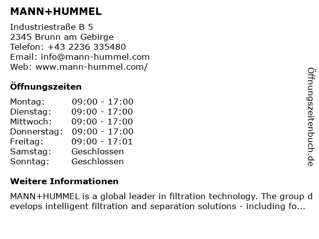 | Öffnungszeiten MANN+HUMMEL in Brunn am Gebirge anzeigen | |
