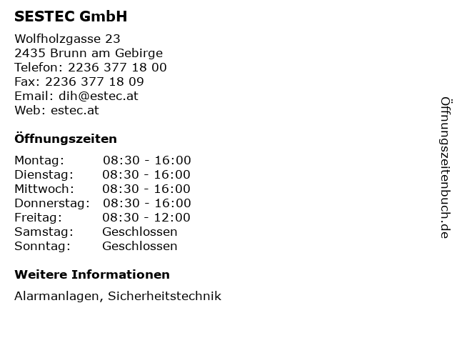 | Öffnungszeiten SESTEC GmbH in Brunn am Gebirge anzeigen | |