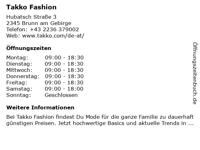 | Öffnungszeiten Takko Fashion in Brunn am Gebirge anzeigen | |