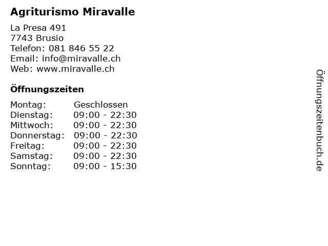 | Öffnungszeiten Agriturismo Miravalle in Brusio anzeigen | |