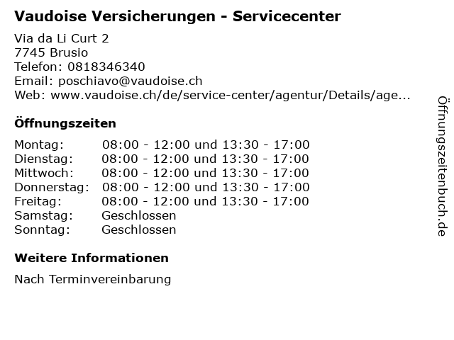 3 Schweizerische Mobiliar Versicherungsgesellschaft - Büro Poschiavo (Entfernung: 0,94 km) Via da Mez 179, 7742 Puschlav 4 Zurich Versicherungen - Generalagentur Pieder Decurtins, Agentur Valposchiavo (Entfernung: 5,28 km) Via Vegia 308, 7743 Brusio 6 |