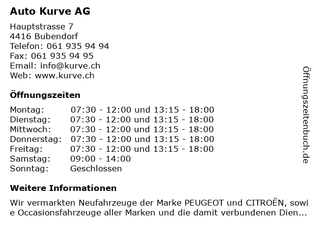 | Öffnungszeiten Auto Kurve AG in Bubendorf anzeigen | |