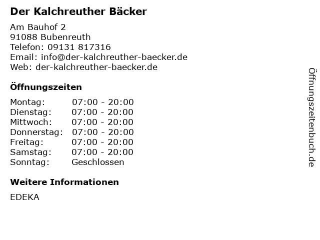 Öffnungszeiten Der Kalchreuther Bäcker in Bubenreuth anzeigen | |