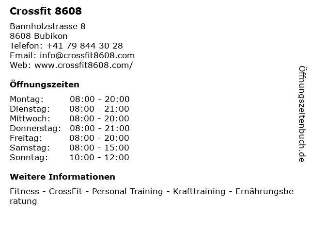 | Telefonnummer Crossfit 8608 in Bubikon (+41 79 844 30 28) anrufen | |
